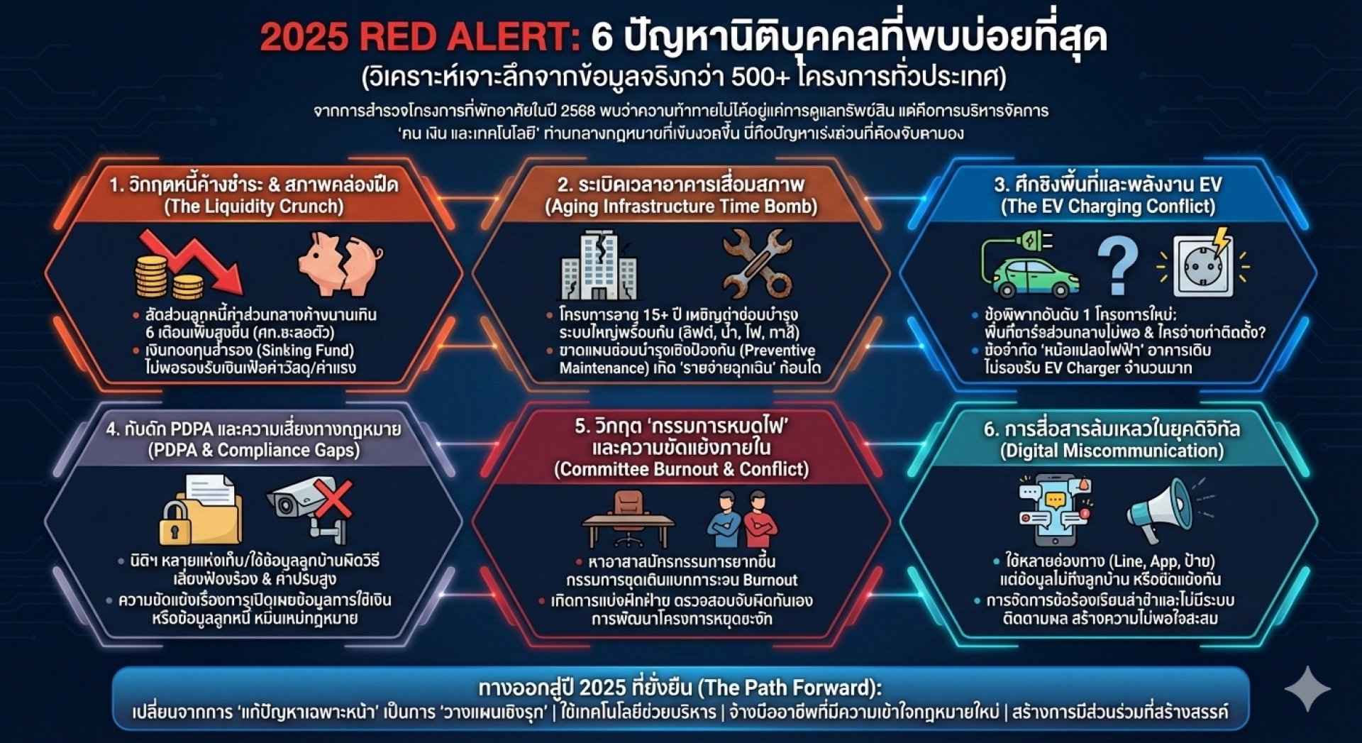 | 6 | กรรมการขาด Expertise/เวลา | พบในโครงการที่กรรมการต้องบริหารนิติบุคคลเองสูงถึง 40-50% | การตัดสินใจล่าช้า, ละเลยการทำ Financial Audit |